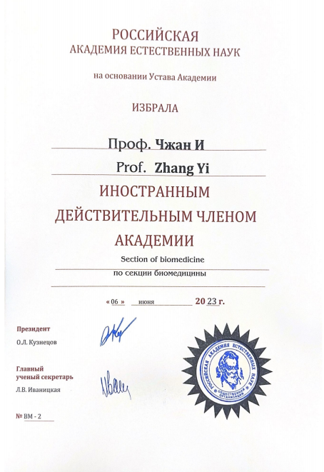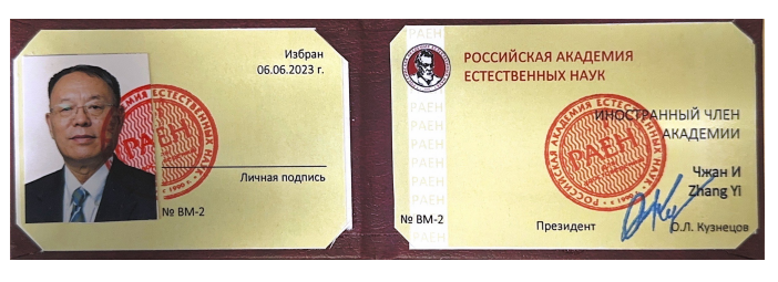 (俄罗斯自然科学院为张译先生颁发的证书)