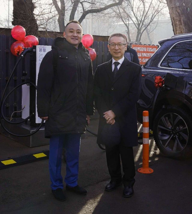 Deltrix 60千瓦直流双枪充电桩充电桩搭载于Sinooil(中石油)2号加油站。Sinooil总经理王俭(右)与Deltrix 哈萨克斯坦公司胡总经理海昕(左)合照。